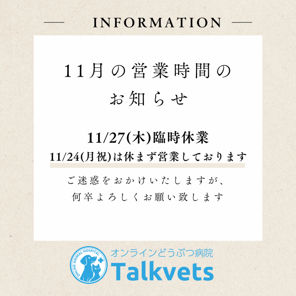 Talkvetsから営業時間についてのお知らせです。